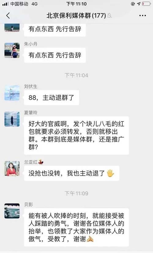 北京保利高層的頤指氣使引起媒體的反感,部分媒體人選擇自動退群。有人當場質疑“這究竟是媒體群,還是推廣群?”隨著退群人數(shù)的增多,一個小時后,文靈在群里表示:“能有被人吹捧的時刻,就能接受被人踩踏的勇氣,謝謝各位媒體人的抬舉,也領教了大家作為媒體人的傲氣,受教了,謝謝。”