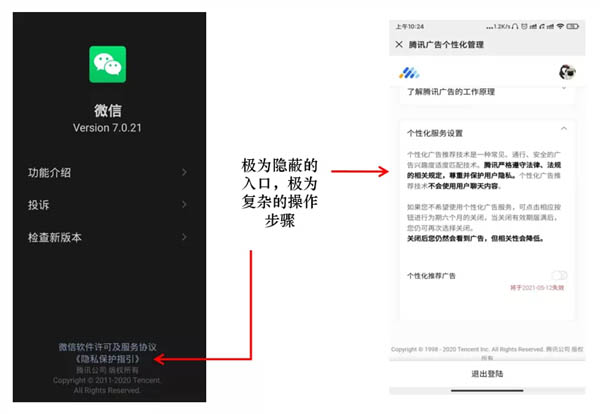 此前,上海市消保委在報(bào)告指出,微信App不僅隱私政策規(guī)則冗長復(fù)雜,而個(gè)性化廣告推薦關(guān)閉入口不僅極其隱蔽,并且關(guān)閉流程設(shè)置繁瑣。