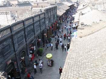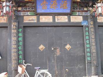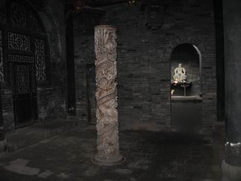 平遙古城內(nèi)的景點(diǎn)比較多的是票號(hào),十八個(gè)景點(diǎn)我們只去了十個(gè),其他的都是票號(hào)和鏢局,內(nèi)部擺設(shè)大同小異。票號(hào)始祖“日升昌”當(dāng)然是非去不可的,除了建筑外觀與現(xiàn)代銀行不一樣外,內(nèi)部機(jī)構(gòu)設(shè)置簡(jiǎn)直就是現(xiàn)代銀行的翻版。當(dāng)然,這種說(shuō)法應(yīng)該反過(guò)來(lái),現(xiàn)代銀行是無(wú)數(shù)個(gè)“日升昌”的翻版。還有“協(xié)同慶票號(hào)”,以其巨大的地下金庫(kù)聞名,它地下的部分和地上的部分是一樣大面積,從隱蔽的入口沿石階小心走下去,好似進(jìn)入一個(gè)大天井,天井四周是一扇扇小門,里面就是堆放真金白銀的小倉(cāng)庫(kù)。天井正中一根盤龍石柱,高約二人,粗有半米,一條龍完整的沿柱子盤旋上升,雕工細(xì)致而不繁瑣,這在平遙是很少見(jiàn)的雕工。在一家票號(hào)內(nèi)我們還見(jiàn)到了接待客人的地方擺著一張煙塌,在票號(hào),抽大煙是嚴(yán)禁的。這張煙塌設(shè)在談判的房間,可見(jiàn)是專門用于接待客人的,有些類似于現(xiàn)代的請(qǐng)客吃飯洗桑拿。至于鏢局,當(dāng)然是和票號(hào)同生共長(zhǎng)的行業(yè)。內(nèi)部迎面一排武器架,大刀鐵錘的雖不至于十八般兵器全了,不過(guò)也挺震撼的。幾乎每個(gè)鏢局院內(nèi)都有一個(gè)大約一米的石頭元寶,意為招財(cái)進(jìn)寶。