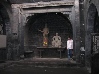 縣衙座落在平遙古城的中軸線上。俗話說(shuō)“衙門口朝南開(kāi),沒(méi)有錢莫進(jìn)來(lái)”,這座縣衙的衙門口照例也是朝南開(kāi)的。縣衙是古城內(nèi)面積最大的一處建筑。正對(duì)門口是大堂,西邊角門是牢獄,東邊是縣太爺?shù)乃郊液蠡▓@和書房,看看多么講究,念個(gè)書還要七折八拐走那么遠(yuǎn)。還有專門一個(gè)小院落是縣太爺?shù)乃饺思Z倉(cāng)。最最后面是祠堂,供奉狐仙。供奉狐仙不是為了招桃花,而是保佑縣太爺升官。兩側(cè)是一排供奉土地神的側(cè)室。這里供奉的土地神可不是一位,而是一排八九位,各個(gè)雕像表情姿態(tài)各異,有的端坐,有的沉思,有的竟然是翹著二郎腿的老頭兒,還有的干脆歪倚著逍遙自在。為什么這么多土地神呢,因?yàn)檫@里的人們不嫌麻煩的把每一條街道都找了個(gè)土地神,真真可愛(ài)。