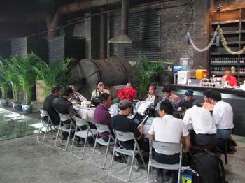 在柴油機(jī)廠展區(qū)的作品是比較知名的攝影家的作品,以風(fēng)景照居多,還有人物特寫。柴油機(jī)廠展區(qū)的作品都是因地制宜擺放,一臺(tái)臺(tái)油乎乎的機(jī)床上面這兒擺一幅那里擺一幅,全非一般展覽那種正經(jīng)八百的布展方式。然而這種奇特的結(jié)合在這座古城竟然讓人感覺(jué)很正常,似乎天生就應(yīng)該是這樣子的。崎嶇不平的土路并不好走,那天天氣還非常炎熱,是我們?cè)谏轿鬟@五天內(nèi)最炎熱的一天。在柴油機(jī)場(chǎng)最里側(cè)有一家很著名的平遙酒吧。酒吧外是汾酒搭建的一個(gè)大棚做促銷,小瓶裝竹葉青才五元一瓶,不愧是原產(chǎn)地,就是便宜,在外地都要賣到十四一瓶。酒吧內(nèi)沒(méi)有任何裝飾,就是利用柴油機(jī)廠的一間廠房改造而成,屋頂?shù)醯暮芨?,南面的墻上兩人高的地方是一排類似百葉窗的木窗子,酒吧內(nèi)黑乎乎的,光線透過(guò)窗外斑駁的樹(shù)葉射進(jìn)室內(nèi),一縷縷陽(yáng)光就像紡紗的絲線,縷縷清晰可見(jiàn),真是說(shuō)不出的藝術(shù)感,吸引了很多人端著相機(jī)一陣狂拍。
