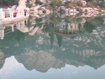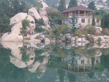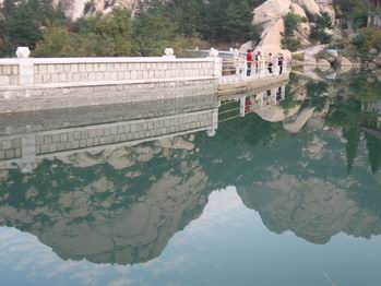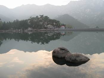 二龍山的石頭非常有特色,與浮山的石頭氣勢截然不同。如果說浮山的山石是桀驁不馴的藝術(shù)家,那么二龍山的石頭就是粗重大氣的山東大漢。遠遠近近、層層疊疊的山峰似無數(shù)張?zhí)鴦拥男碾妶D重疊在一起,一個波峰接一個波峰,深深淺淺的色彩似隨意灑脫的潑墨山水。山腳一個大壩,上游不經(jīng)意流下來的細細水流,到這里竟然匯聚成一汪碧綠的深潭,碧波蕩漾溫柔恬靜如二八少女,更反襯出山巒的雄偉蒼翠。