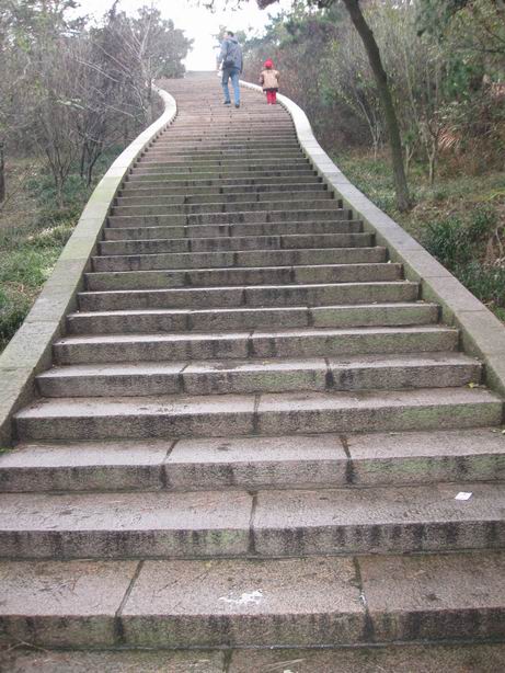 自山下逶迤而上,途經(jīng)一片青翠竹林,雖時(shí)已是冬天,但茂林修竹,頗具一番清雅之氣。出了竹林,卻是小橋流水,工整別致,橋墩上綠銹斑駁,倒也顯出些歷史感來(lái)。越往上走,越是靜謐安然,旁邊樹(shù)上已全部沒(méi)了葉子,蒼蒼古拙,像是走進(jìn)了歷史。驀地,一條蜿蜒曲折的石階象幅畫一樣擺在我們面前,延伸向上而去,遙無(wú)盡頭,旁書“云梯”,走過(guò)這么多地方,象這么貼切的景觀題字實(shí)在不多,這云梯不象別的石階,生硬冷漠成銳角形,而是圓潤(rùn)光滑,拐角處處理得象是工筆畫里的女子云裳,如若無(wú)物,真是柔美至極。信步走去,也是仿若平地青云,石階非常平滑,意識(shí)不到是在登山,不覺(jué)已走完了云梯500多級(jí)石階。沿途繼續(xù)向上,旁邊居然長(zhǎng)著很多蘆葦,“荒草萋萋鸚鵡洲”的感覺(jué),心里很是詫異。